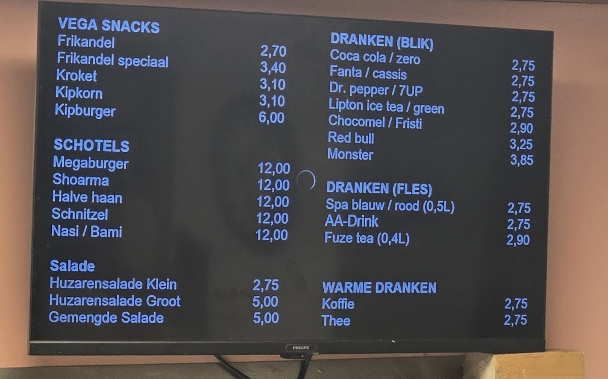 The menu offers a variety of cafeteria-style options suitable for quick meals and casual dining. Visitors can expect a selection of snacks, light bites, and traditional fried items. The menu includes specific highlights such as the Sundae Caramel and a dish called Schotel Halve Haan.